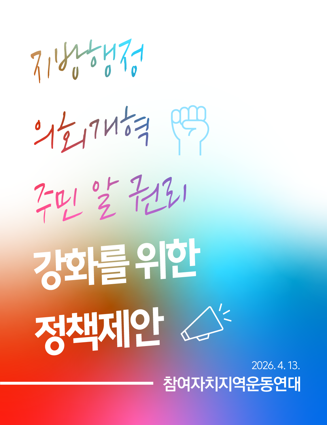 민선 지방자치가 시작된 지 30년이 지났지만, 지방정부와 지방의회의 정책 결정 과정에서 시민 참여와 알 권리 보장을 위한 제도적 장치는 여전히 부족한 상황입니다. 참여자치지역운동연대(참여자치연대)는 오늘(4/13), 6·3 지방선거를 앞두고 지방행정·의회개혁 및 주민 알 권리 강화를 위한 6대 정책제안을 발표했습니다.