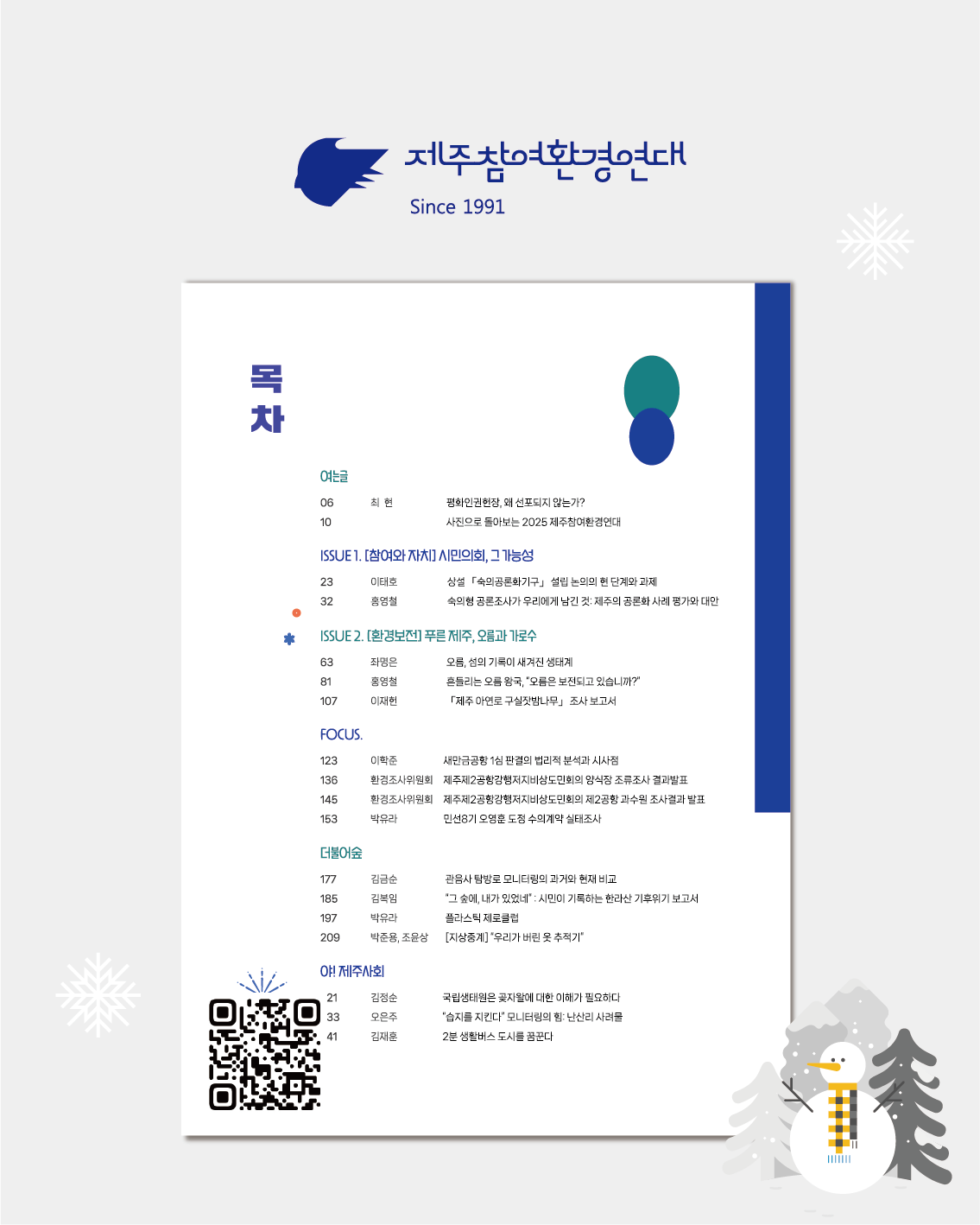 ○ 제주참여환경연대(대표. 홍영철,이학준)가 2025년 활동과 제주사회의 현안을 담은 기관지 「여럿이함께숲이되자」 64호를 발간했다고 밝혔다.